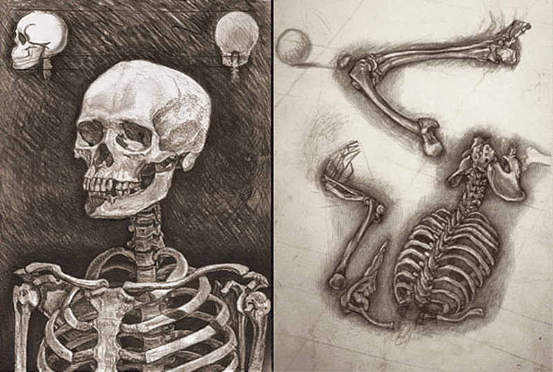 charcoal anatomy studies from skeleton