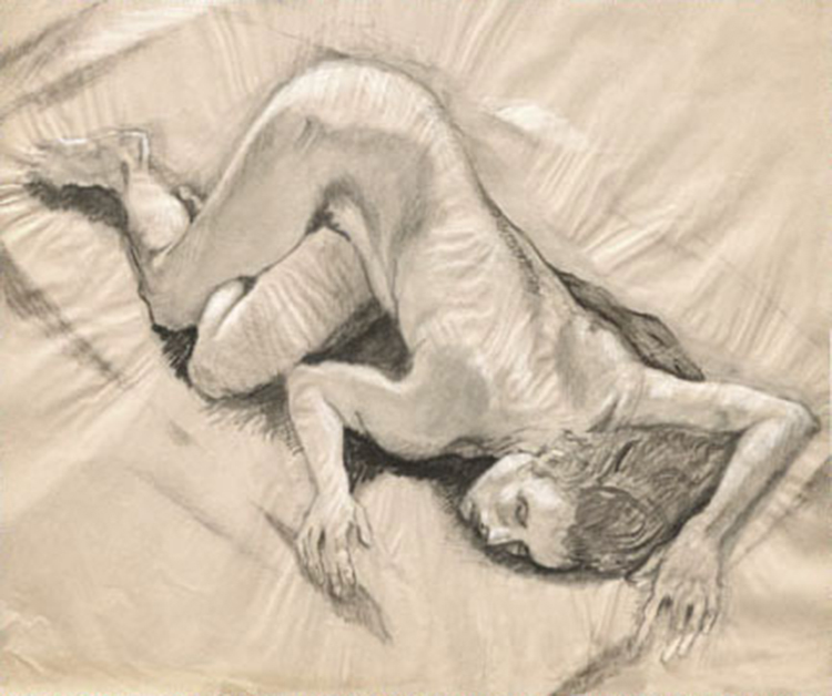 Life drawing on paper with charcoal, conte crayon and sumi.