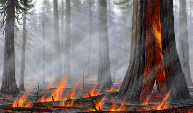 Natural forests evolved in the presence of fire. The heart of this western red cedar was consumed by fire why is the crown still green? Live tissue still survives under the bark, transporting food down from the leaves and water and nutrients up to the crown. |