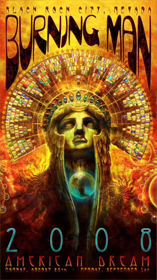 'AMERICAN DREAM' Official Burning Man 2008 Poster by Cory and Catska Ench Purchase prints from Burning Man website click on the image to return to thumbnails